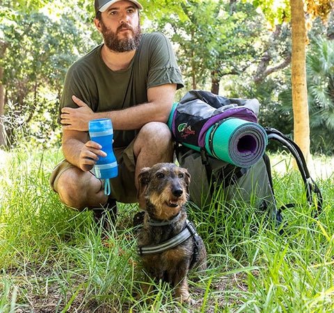 An original and practical bottle-shaped food and water container which is very useful for feeding and watering your pets easily at any time or place. The interior is divided into two separate sections. one for holding water and the other for food. Its two lids are also used as bowls for serving the food and water to your pet. It is easy to take apart and clean and its silicone seal prevents any seepage or leaks. Its innovative portable design with hanging cord makes it easy to carry hanging from your backpack. around your wrist. or in your bag while on your walks. trips. travel. etc.