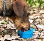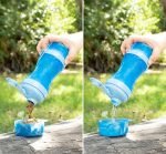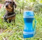 An original and practical bottle-shaped food and water container which is very useful for feeding and watering your pets easily at any time or place. The interior is divided into two separate sections. one for holding water and the other for food. Its two lids are also used as bowls for serving the food and water to your pet. It is easy to take apart and clean and its silicone seal prevents any seepage or leaks. Its innovative portable design with hanging cord makes it easy to carry hanging from your backpack. around your wrist. or in your bag while on your walks. trips. travel. etc.