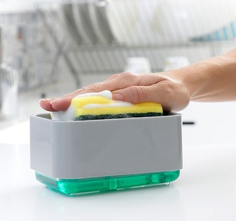 An antibacterial and hygienic kitchen soap dispenser with an original multi-use design that prevents the accumulation of bacteria. drips and water or soap spills that can mess up the kitchen. It has a quick drying stand for the sponge which allows it to drain through its ventilation holes. It also has a drip tray to easily remove the water that drips from the sponge. This compact manual dispenser is very convenient and easy to use. and is very useful for washing dishes. etc. The soap is placed directly onto the sponge by pressing it against the dispenser. It also helps to keep the kitchen tidy. thereby saving time and effort. The soap container has a capacity of 330 ml and is transparent. to allow you to see how much soap there is at all times. It can be used with any type of sponge. scourer. dishcloth. etc. and can be taken apart completely. making it easy to clean.