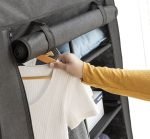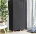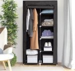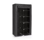 A complete and versatile clothes and shoe organizer which is ideal for use anywhere as an additional portable wardrobe (home. camping. travel. etc.). This fabric wardrobe has a plastic and steel frame and protects clothing from dust or from outside dirt. It has a roll-up door with zipping. a rail for hanging clothes hangers and shelves for placing clothes. shoes. accessories. etc. It can be cleaned easily with a damp cloth.