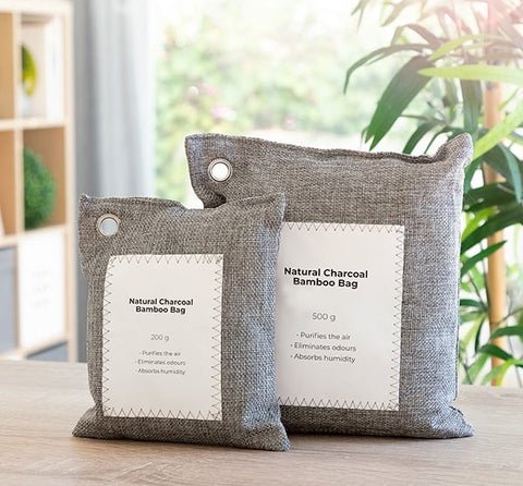 A set of 2 activated bamboo charcoal linen bags of different weights and sizes that purify the air and absorb moisture and bad odours naturally without harmful chemicals and pollutants. Two metal hooks are included for hanging which makes them easy to place anywhere you wish. They are reusable. long-lasting (2 years) and are easily reactivated by exposing them to the sun once a month for approx. 3 to 5 hours. so that they regain their purifying properties. Also. once its useful life has expired. its content can be used as a plant fertiliser. A more effective. eco-friendly and natural alternative for enjoying a fresh. clean. healthy and more breathable environment. Ideal for wardrobes. shoe racks. drawers. bathrooms. kitchens. cars. etc.