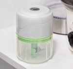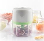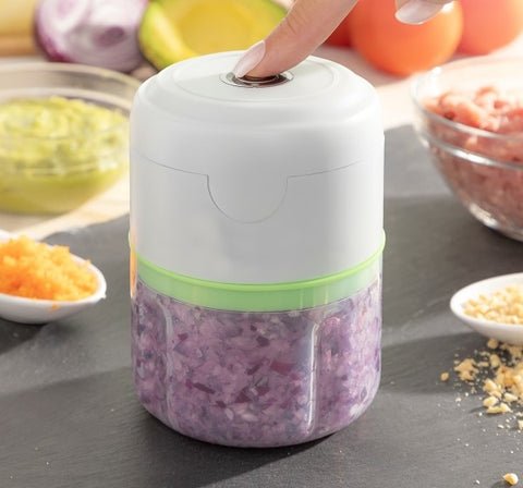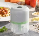 A versatile rechargeable portable mini chopper which is convenient and practical for doing all types of chopping. whether thicker or finer. depending on the desired texture. It enables you to chop many different foods quickly and effectively (dried nuts. vegetables. fruit. meat. etc.). The compact. wireless design. without cables or plug. means it can be taken and used anywhere. It is also lightweight and takes up very little space for storage. It has a protective. splashproof cover and stainless steel triple blades. It has a 250ml capacity and a single button for turning on/off at the top which makes it easy to use. It can be taken apart easily for cleaning. Includes a USB to micro USB cable.