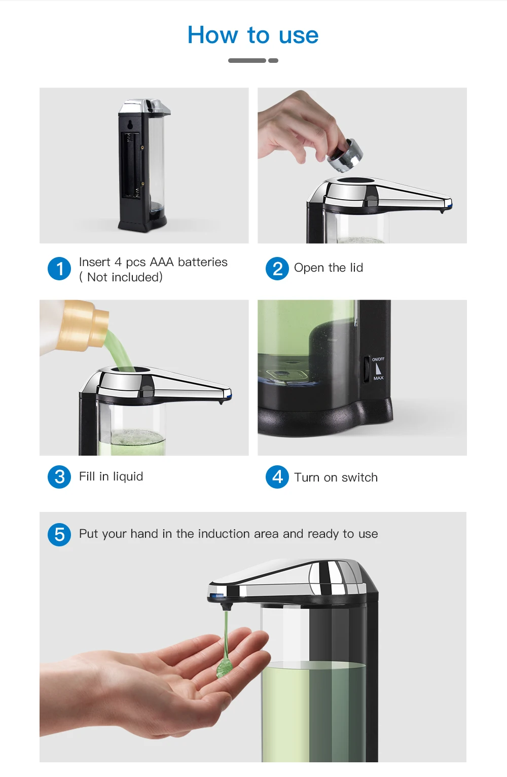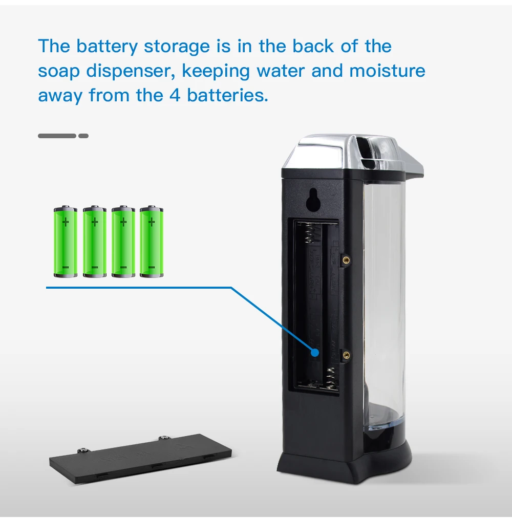 ✔ Waterproof Durable: Silicone sealed battery compartment protects 4″AA” batteries (not included). Longer lasting than most other soap dispensers that have no sealed battery compartment with over 35.000 times of liquid dispensing.