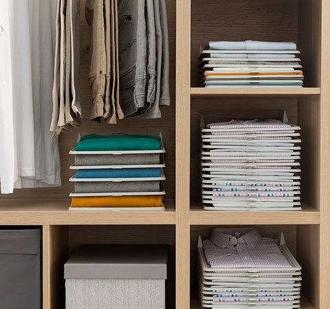 A set of clothes organizer trays which are very practical for storing properly folded and organized clothing in wardrobes. drawers. suitcases. etc. They enable the clothing to be viewed and have a fastening tab so they can be lifted easily and the chosen item of clothing can be removed. A simple way to optimize space. prevent creases or untidiness. and access clothes more quickly and conveniently. Thanks to their portable and stackable design. they take up very little space and are ideal for shirts. t-shirts. polo shirts. etc.