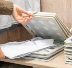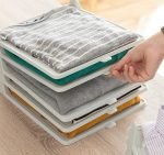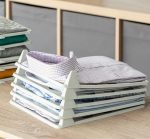 A set of clothes organizer trays which are very practical for storing properly folded and organized clothing in wardrobes. drawers. suitcases. etc. They enable the clothing to be viewed and have a fastening tab so they can be lifted easily and the chosen item of clothing can be removed. A simple way to optimize space. prevent creases or untidiness. and access clothes more quickly and conveniently. Thanks to their portable and stackable design. they take up very little space and are ideal for shirts. t-shirts. polo shirts. etc.