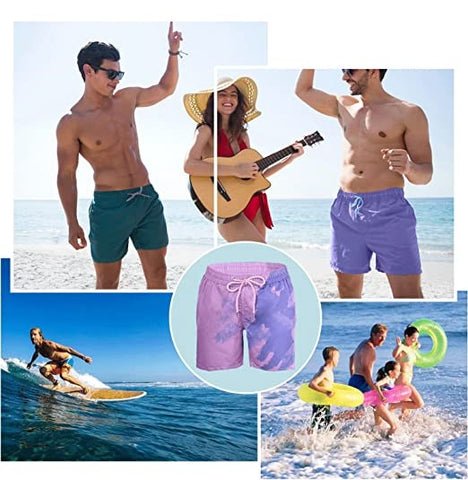 ✔ EXQUISITE DESIGN: Super cool and functional in design. featuring a drawstring elastic waistband at the waist and pockets deep enough on the sides for your phone. sunglasses. keys. and more. The color-changing swimming trunks are covered with a layer of inner mesh. which will not cause discomfort due to the friction between the thighs and the swimming trunks. making you feel very breathable and comfortable to wear.