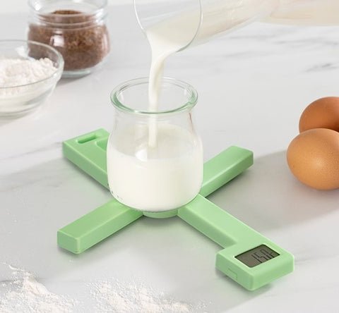 A set of digital kitchen scales with an original space-saving. folding design. making them easier to store in drawers. cupboards. etc. They open and fold easily like a pair of scissors and are very convenient and easy to use. All you need to do is unfold the scales and place the products or a container to weigh them in directly in the centre. as they have a tare and automatic switch off function.