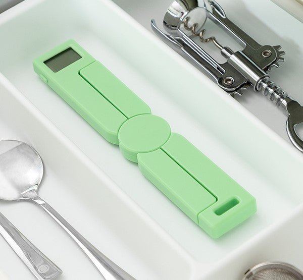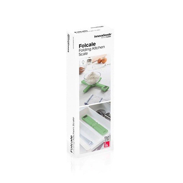 A set of digital kitchen scales with an original space-saving. folding design. making them easier to store in drawers. cupboards. etc. They open and fold easily like a pair of scissors and are very convenient and easy to use. All you need to do is unfold the scales and place the products or a container to weigh them in directly in the centre. as they have a tare and automatic switch off function.