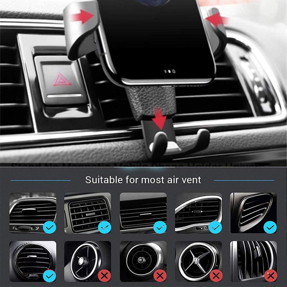 Easy to Handle: Tool-free installat this gravity air vent car phone holder . Simply clip it to the car air vent . then put down your smartphone in the car phone holder’s bracket . The car phone holder cradle will auto lock by gravity securely .