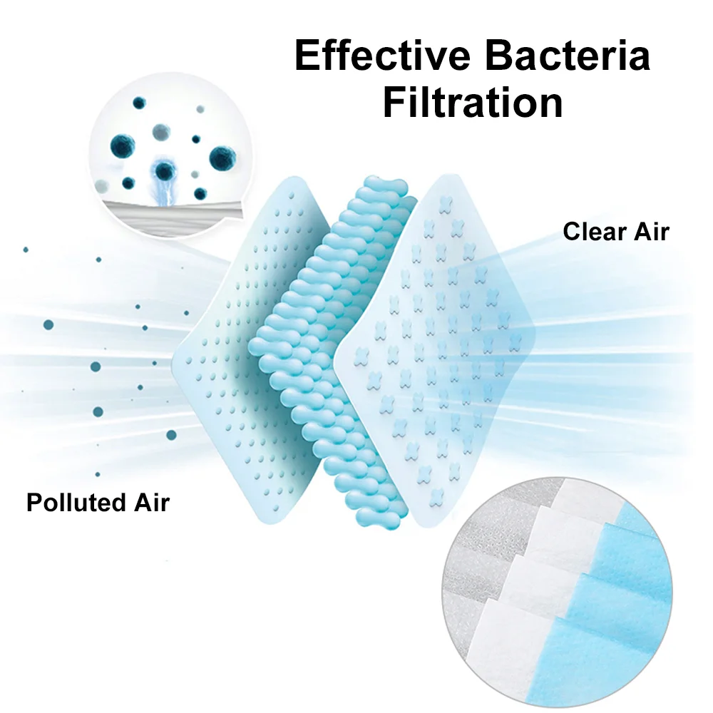 ✔ Three Layer Protection: The outer layer uses waterproof non-woven fabric to isolate splash liquid. The middle layer is a melt-blown filter layer to block dust and particulate matters. The inner layer uses a skin-friendly double-layer non-woven fabric. moisture-proof. and breathable.