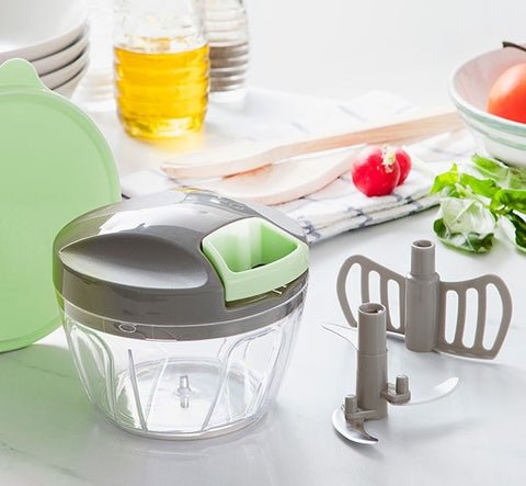 An original and practical food chopper. It is very easy to use and chops food using a simple manual cord mechanism. You simply hold the chopper with one hand and. with the other hand. you pull the cord on the lid a number of times to achieve your desired level of chopping: the result (larger or smaller pieces) will depend on how many times you pull the cord. The sharpened blades will efficiently chop a wide range of foods. It has a mixing accessory for blending sauces. mixing ingredients. beating eggs. etc. It also has an additional lid for sealing the container. which will enable you to store the chopped ingredients. Its compact design means it takes up hardly any space and it is easy to take apart for cleaning.