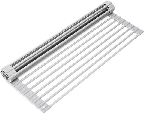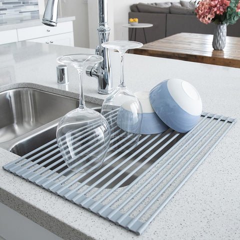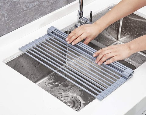 ✔ MULTI-PURPOSE: Drain dishes and protect countertops with a roll-up drying rack. designed to securely fit over your sink. Perfect for kitchen accessories. dish drying rack. and more to simplify everyday chores and meal preparation. It is also great for fruit cutting and drying.
