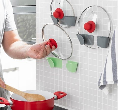 An original set of 3 adhesive holders for saucepan lids which is very convenient and practical for keeping the kitchen tidy and making maximum use of space. This versatile multi-purpose kitchen organiser can be used as a holder for saucepan. frying pan. casserole lids. as well as a hanger or holder for other utensils (chopping boards. etc.). Its portable. adjustable and multi-position design makes it is extremely useful and for many uses. Each holder consists of 2 separate pieces and adhesives that can be positioned at the required distance to fully adapt to the size of each lid or kitchen utensil. They can be stuck to the inside of kitchen cupboard doors. on the wall. or anywhere else. depending on your needs and preferences. They are easily installed using high-quality adhesives (Nano PU Gel) which stick to the surfaces giving a firm hold without the need for assembly or tools and without damaging walls or cupboards. They take up little space. are lightweight. easy to transport and to store.