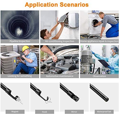 【32.8ft Cable & 5.5mm Diameter Camera】Flexible Semi-ridged cable with 0.216” diameter camera bends and holds its shape to get into a wide variety of confined places. pipes. curved holes. and so on. Even in dark areas. you still can see clearly as the 6 adjustable LED lights on the tip can help you find it easily.
