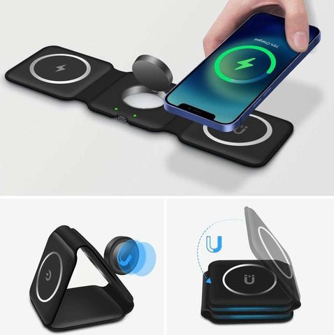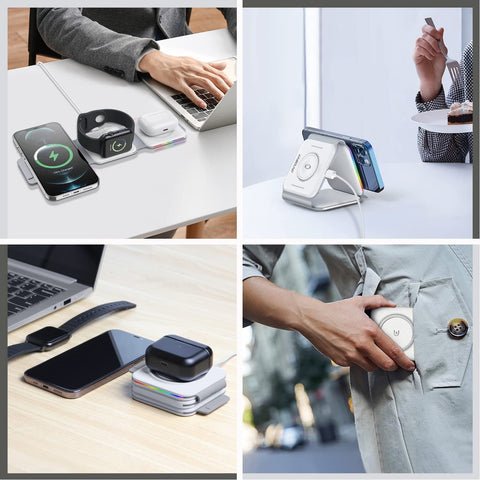✔ FOLDABLE DESIGN: With ease. smoothly fold it into a phone stand or lay it out flat to charge 3 devices at once. or fold it away for when it is needed. Designed with a slim interchangeable charger that is convenient for all! Inside the soft-touch silicone. holds our advanced magnetic charging technology. It can magnetically stick to iPhones with MagSafe capabilities.