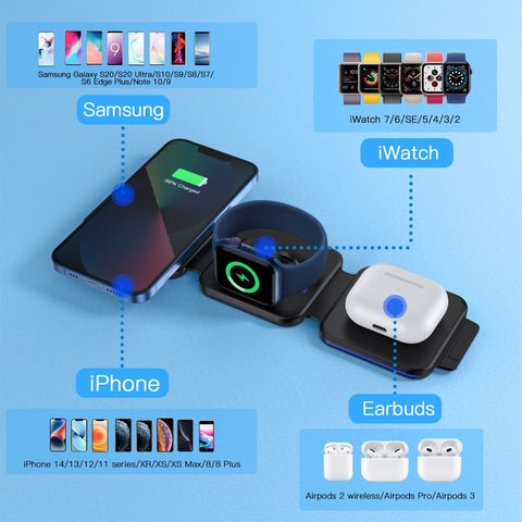 ✔ UNIVERSAL COMPATIBILITY: Supports mobile phones with wireless charging function. Airpods. and iWatch that comply with the Qi standard. Widely compatible with iPhone 14 series/13 series/12 series/11 series/X/XS/XS Max/8. Apple watch 7/6/5/4/3/2/SE. Airpods Pro/3/2. Samsung. and other Qi-enabled phones.